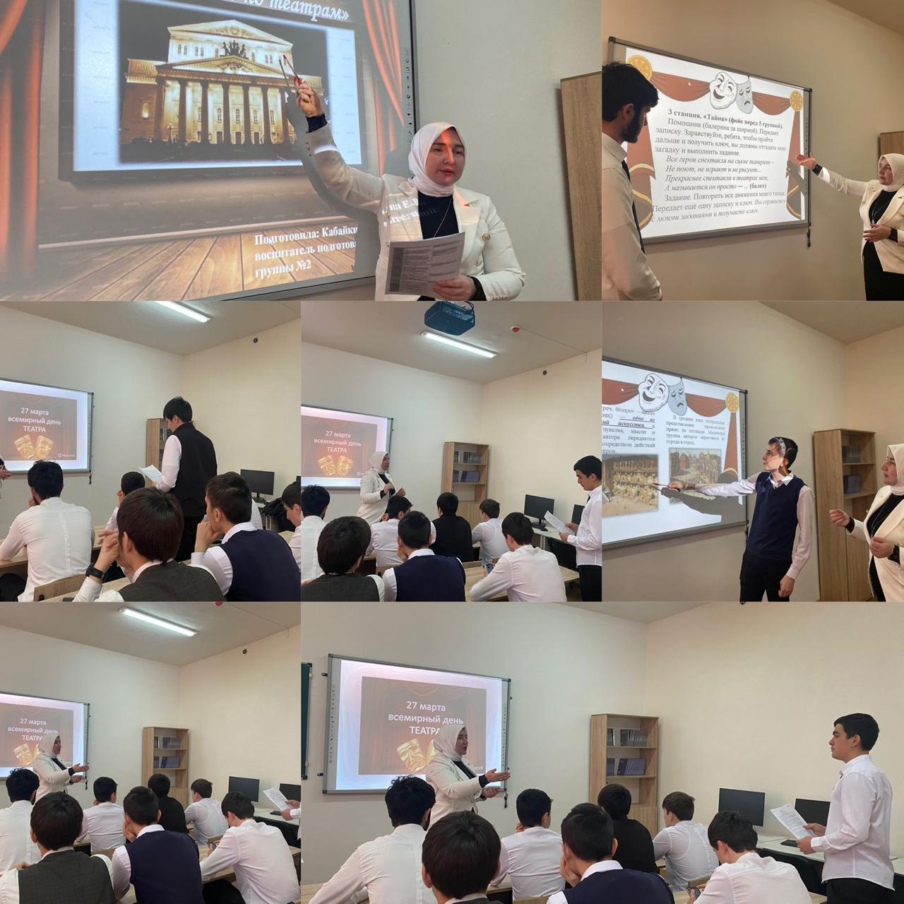 27.03.2024Всемирный день театра – праздник всех театральных деятелей и ценителей этого искусства. Вот уже более 50 лет, 27 марта все театралы отмечают профессиональный праздник. Сегодня российские театры, которых в стране более 1,5 тысяч, классифицируются на музыкальные, оперные, детские (кукольные), оперы и балета, экспериментальные, и у каждого из них есть свои таланты и их почитатели.Советник директора по воспитанию ГБПОУ «Аргунский государственный техникум» Джабраилова Л.М., совместно со студентами 1-2-х курсов, провела мероприятие «Тайна старого театра». Это познавательное мероприятие, позволило студентам узнать об истории русского театрального искусства. Цель данного мероприятия:выражать понимание ценности отечественного и мирового искусства, российского и мирового художественного наследия.