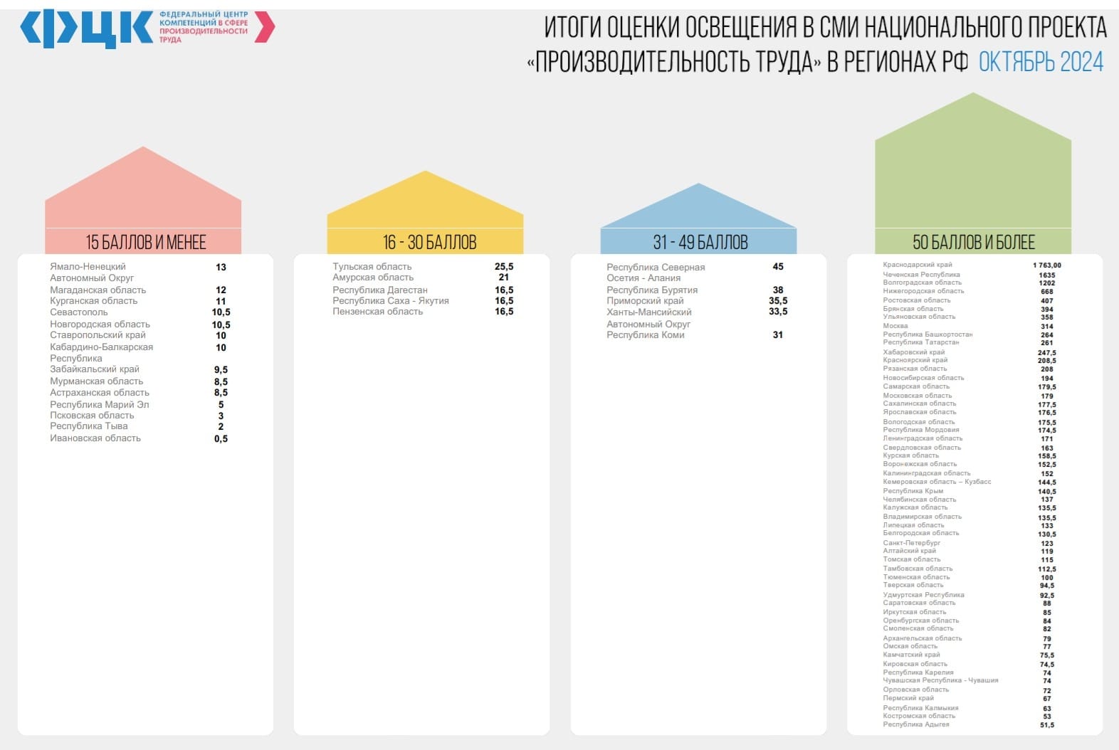 26.11.2024По итогам подведенным ФЦК за октябрь 2024 года, Чеченская Республика вошла в лидирующую группу и заняла второе место, уступив лишь Краснодарскому краю.