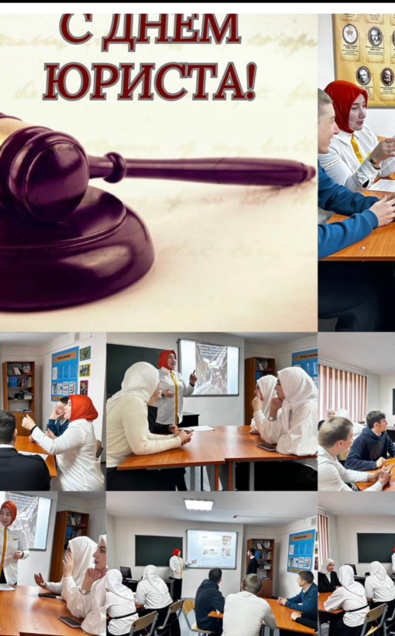 04.12.2025Ежегодно 3 декабря в России отмечается профессиональный праздник всех юристов, независимо от сферы их профессиональной деятельности — День юриста, установленный Указом Президента Российской Федерации от 4 февраля 2008 года № 130 «Об установлении Дня юриста». Советник директора по воспитанию и взаимодействию с детскими общественными объединениями ГБПОУ «Аргунский государственный техникум» Джабраилова Л.М.,совместно со студентами техникума по специальности « Юриспруденция» провела мероприятие ( круглый стол «Юрист в деле»),в рамках которого участникам предоставилась возможность поучаствовать в дискуссии о перспективах развития права и профессии юриста🤗